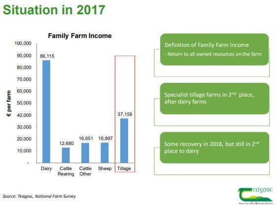 “There has been some recovery in income levels in 2018, on foot of the recovery of prices that we saw at harvest time in 2018, but still tillage farming income is coming in in second place to dairy farms,” Fiona explained.