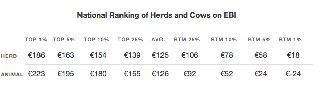 The average EBI of the Top 200 herds is €187 with €56 coming from Milk and €100 from Fertility. This compares with a national average of €125 (Milk €36, Fertility €74).