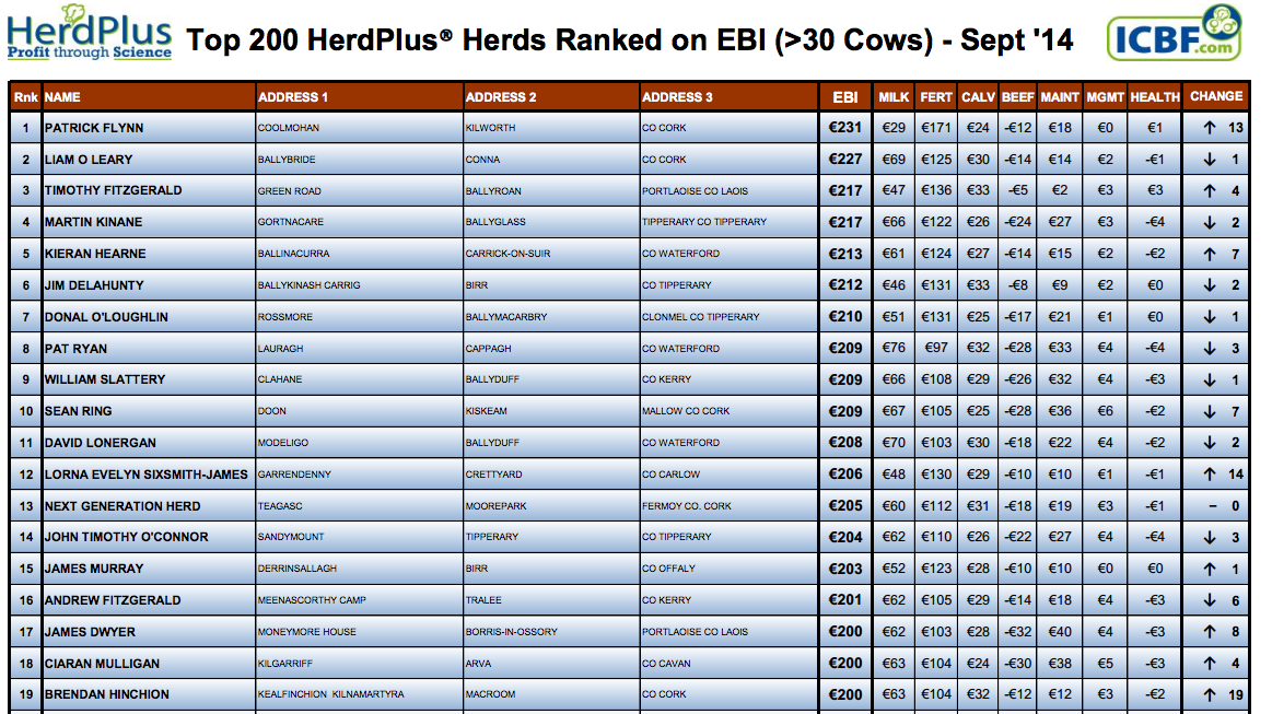 Details of the top 200 EBI herds have been published by the ICBF. Having spent almost three years at the top of the EBI herd listing, Liam O’Leary, Conna, has slipped to second place, having been passed by Patrick Flynn, Kilworth, who jumped 13 places to secure the No.1 spot for the first time.