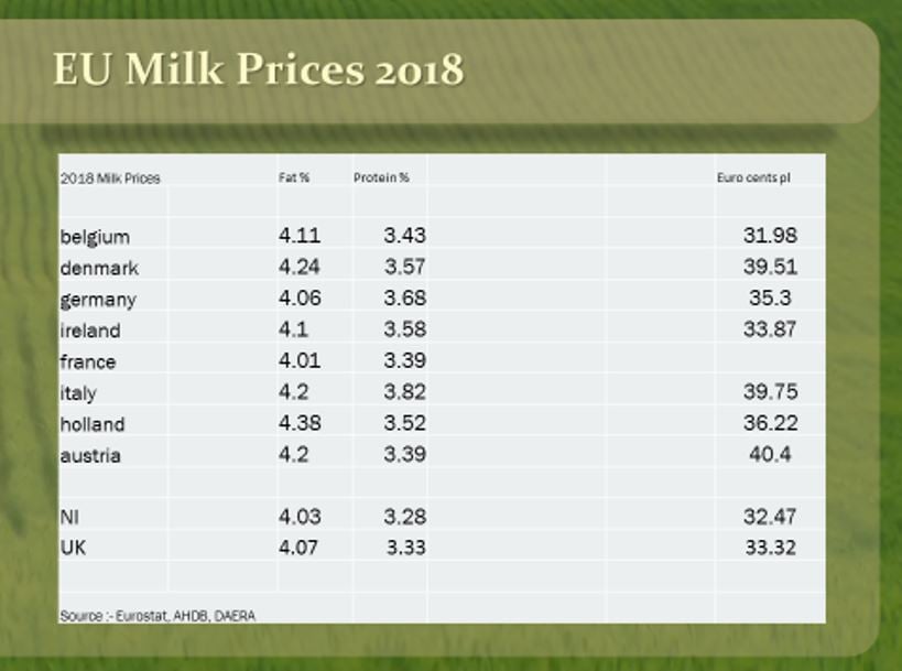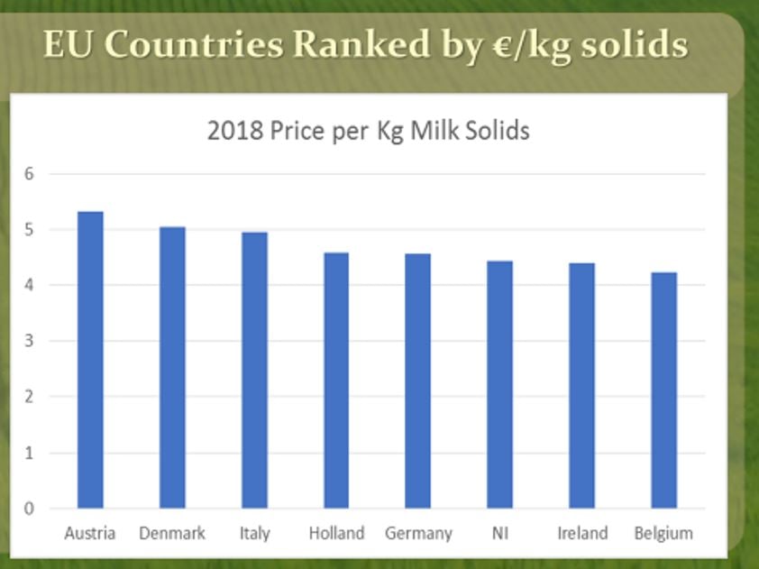 When we look at this graph we can see that our processors are paying fairly competitively for milk on a per kg solids basis, as we were slightly ahead of ROI and Belgium in 2018, and just behind Holland and Germany.