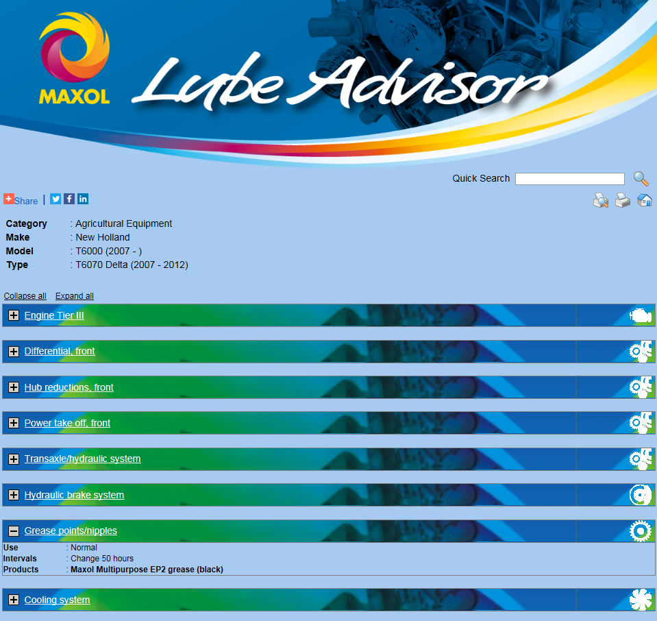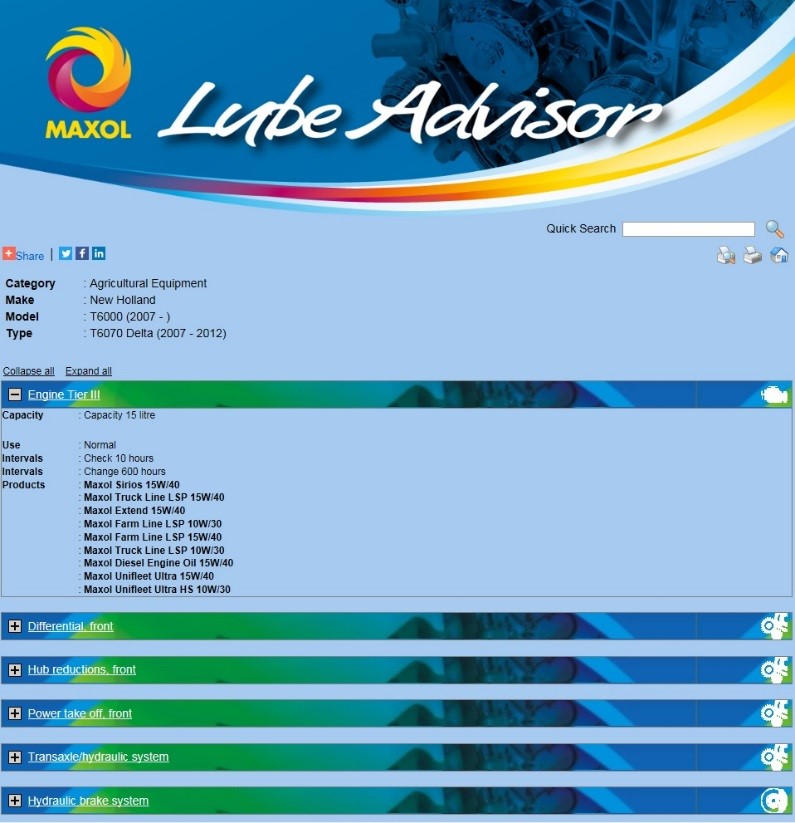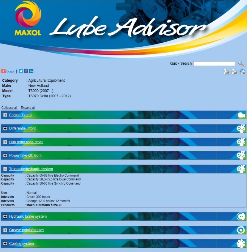For example, if you drive a New Holland T6070 enter those details into Maxol’s Lube Advisor; the recommended oil for that tractor will be shown.