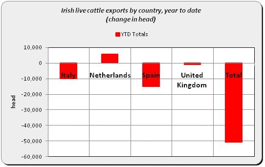 The largest drops have occurred in Spain (15,259), Italy (6,081) and Belgium (21,196), while live cattle exports to Britain have also fallen by 6,771 head or 45.6%.