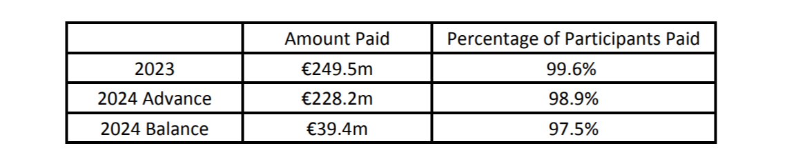 Almost €267.6 million is in respect of participation in the scheme in 2024, while over €249.5 million relates to participation in 2023, the Department of Agriculture, Food and the Marine (DAFM) said in an update.