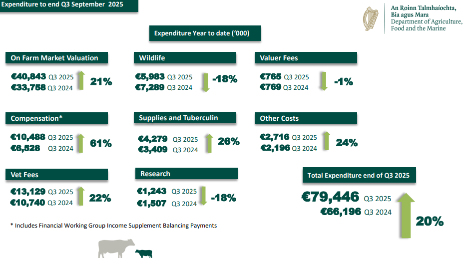 DAFM's latest National Bovine Tuberculosis Statistics also reveal a 21% increase in expenditure relating to the On Farm Market Valuation Scheme (OFMV) - the main compensation scheme available to farmers who experience a TB breakdown in their herd - by the end of Q3 this year.