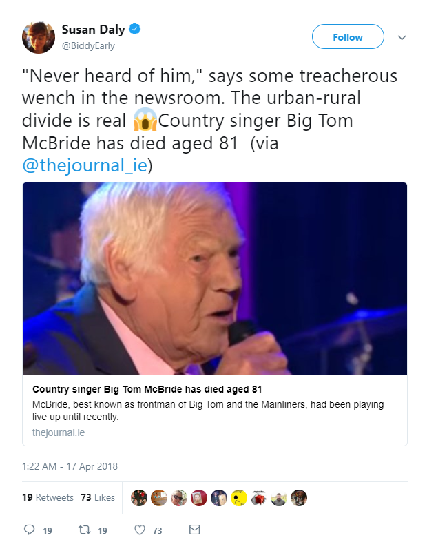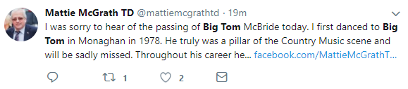 The death was announced earlier this morning (Tuesday, April 17) of iconic country music singer ‘Big Tom’ McBride.