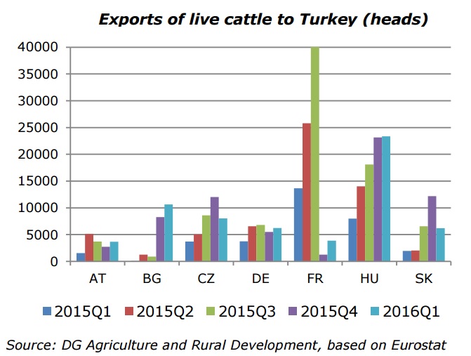 The Commission says Turkey (100,000 head) and Lebanon (45,000 head) remained the two most important destinations of live bovine animals in the first four months of 2016 and represented together almost 50% of total live trade.