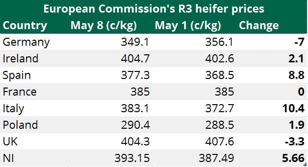 UK and Irish farmers received a similar price for R3 heifers last week, recent figures from the European Commission show.