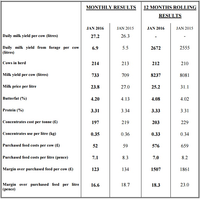 “Following 16 consecutive months of reduction since the peak of £1992 (€2,510) in May 2014, the latest results to January 2016 show an average margin over purchased feed of £1507 (€1,899) per cow.