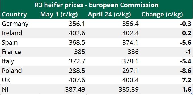 Figures from the European Commission show that UK R3 heifers were 5c/kg dearer than R3 heifers slaughtered in Ireland last week.