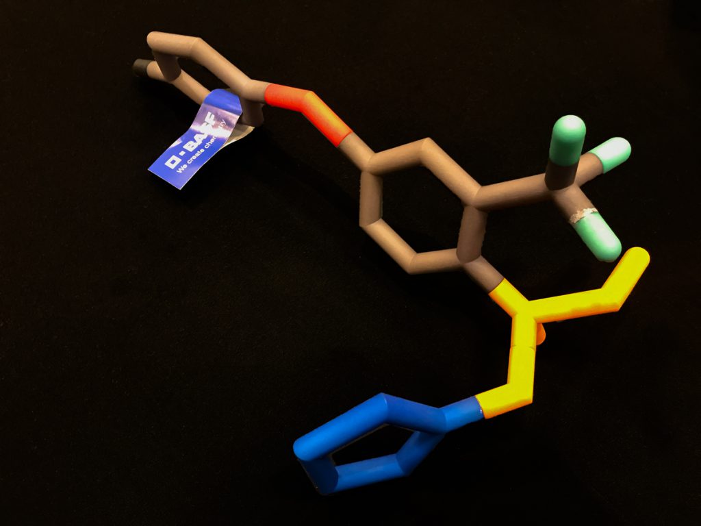 However, when this molecule comes into contact with the fungus it begins to flex. The isoproponal linker – depicted in yellow in the diagram – can flex, rotate and change shape.