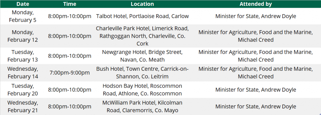 Organised by the Department of Agriculture, Food and the Marine, these meetings will form part of an eight-week consultation period – which will come to an end on March 23, 2018.