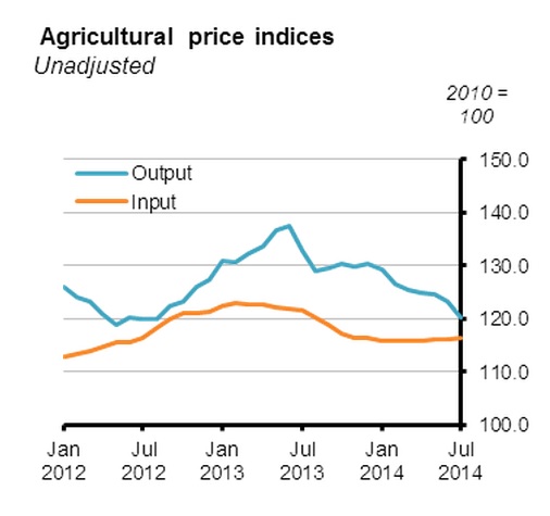 On an annual basis, the agricultural output price index in July 2014 was 9.5% lower than in July 2013. The agricultural input price index was down 4.3% in July 2014 compared with July 2013.