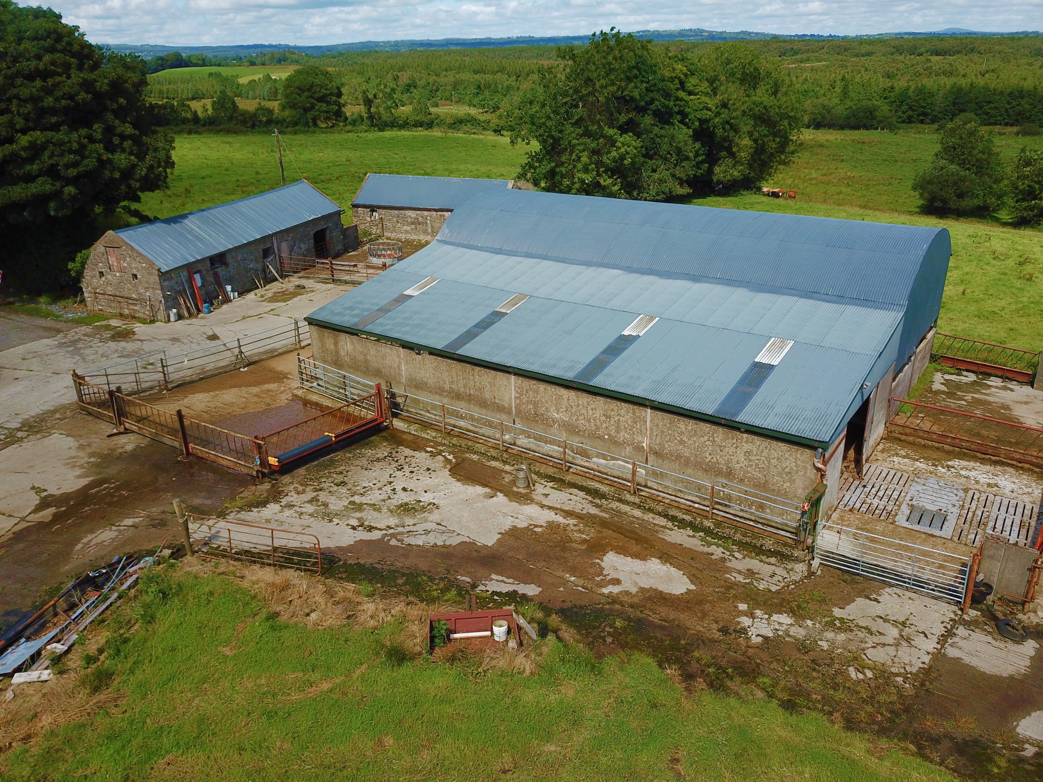 The farmyard consists of a range of farm buildings including a slatted cubicle shed; a hay barn; a bedded shed; and a range of smaller outbuildings.