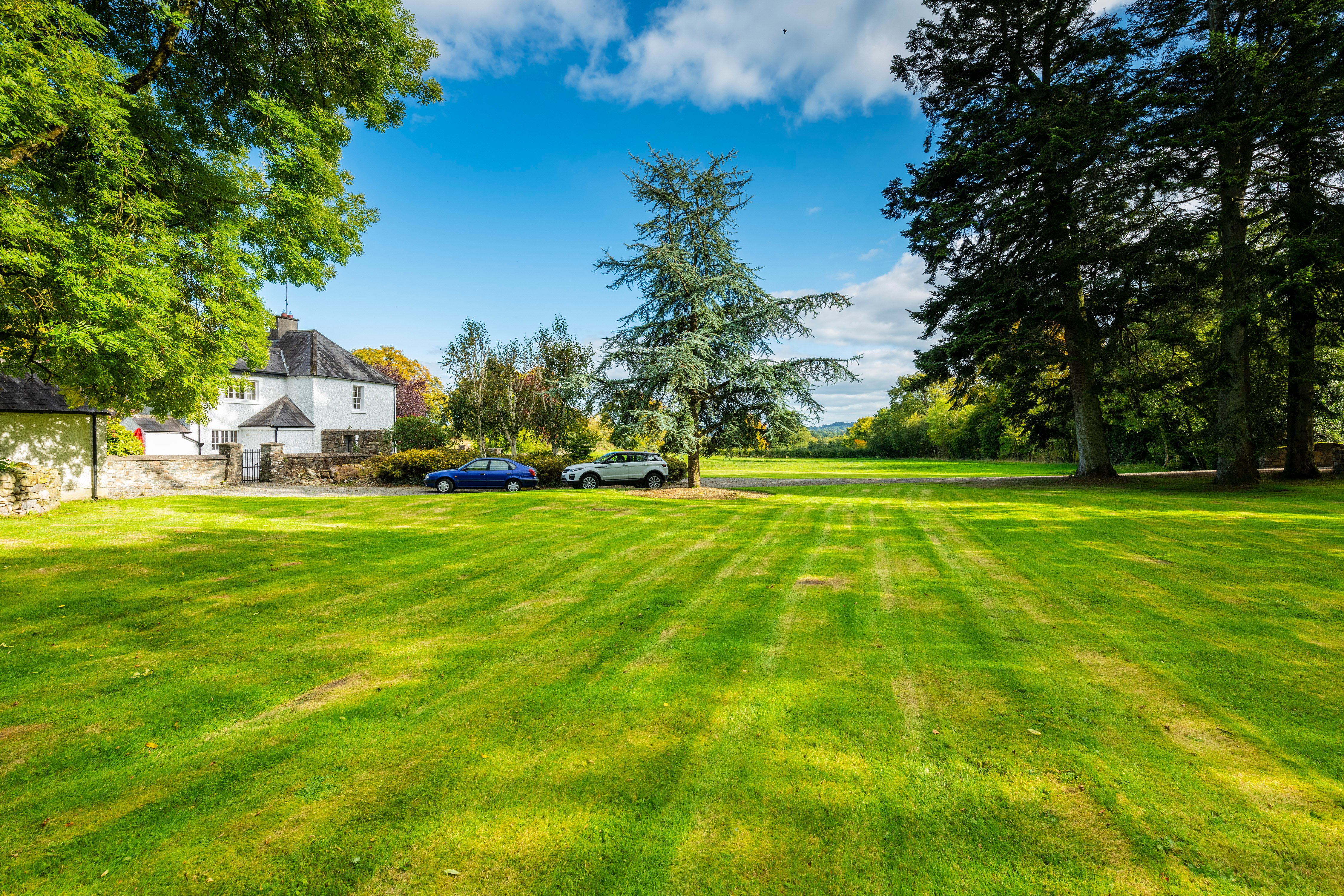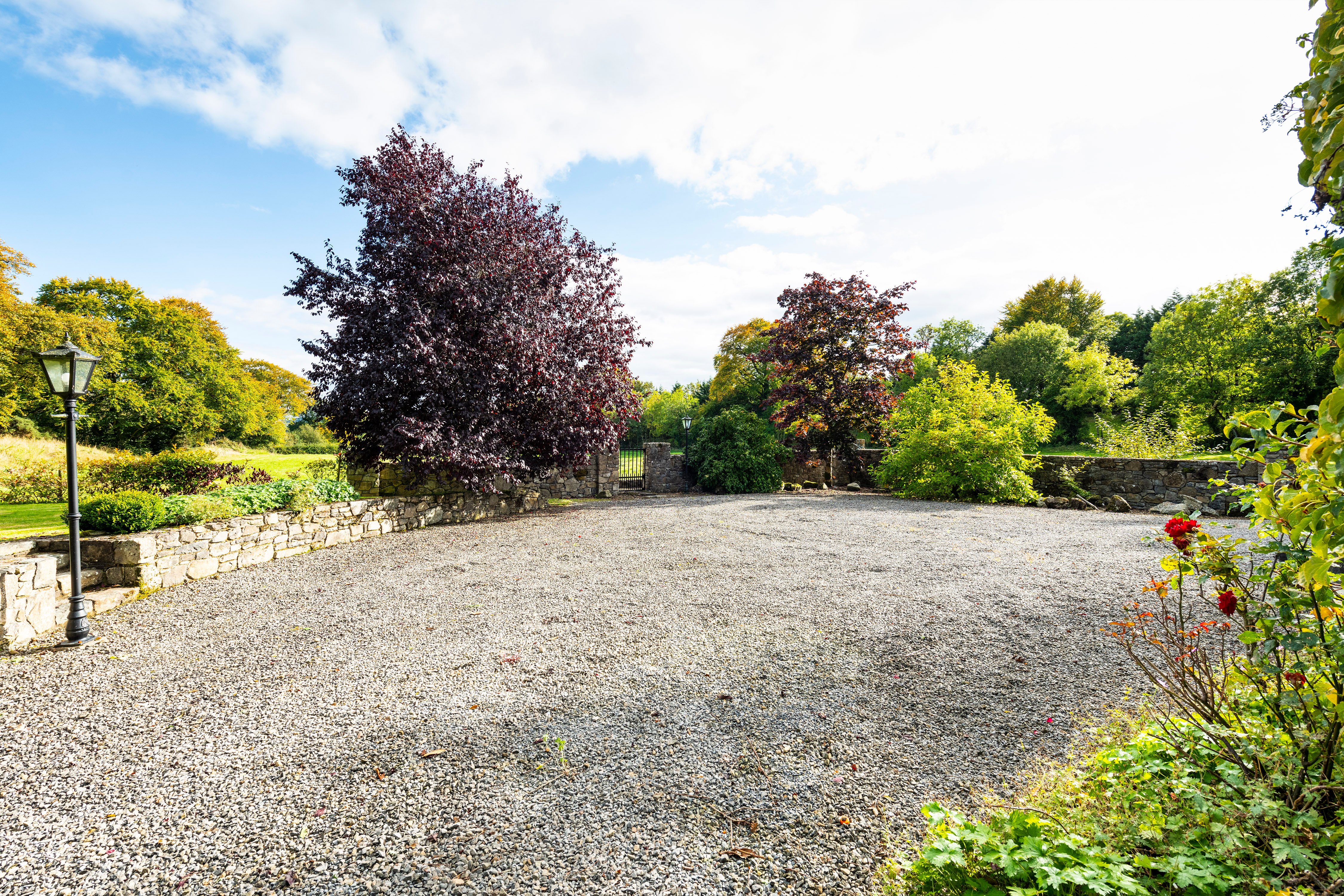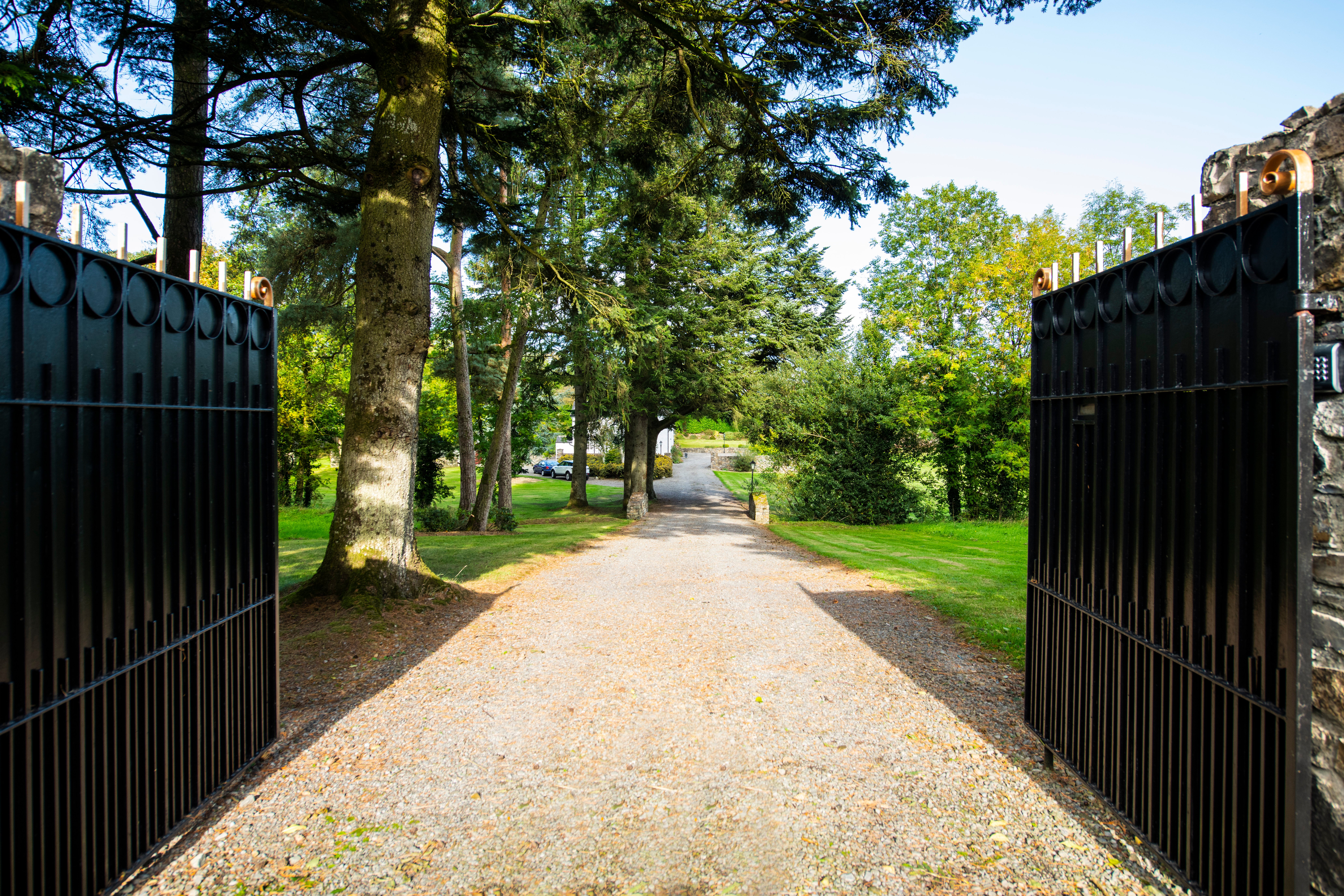 Electric gates cordon off the entrance and lead down a tree-lined driveway over a stone bridge. A gravelled courtyard encompasses the front of the house.