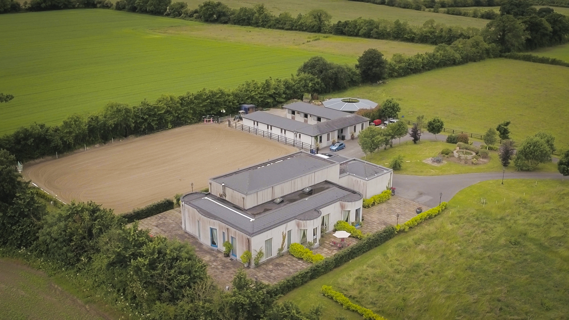 The property is approached through wrought iron gates along a beautiful, long tree-lined driveway. This leads to a turning circle with ample parking to the front of the enclosed stable yard.