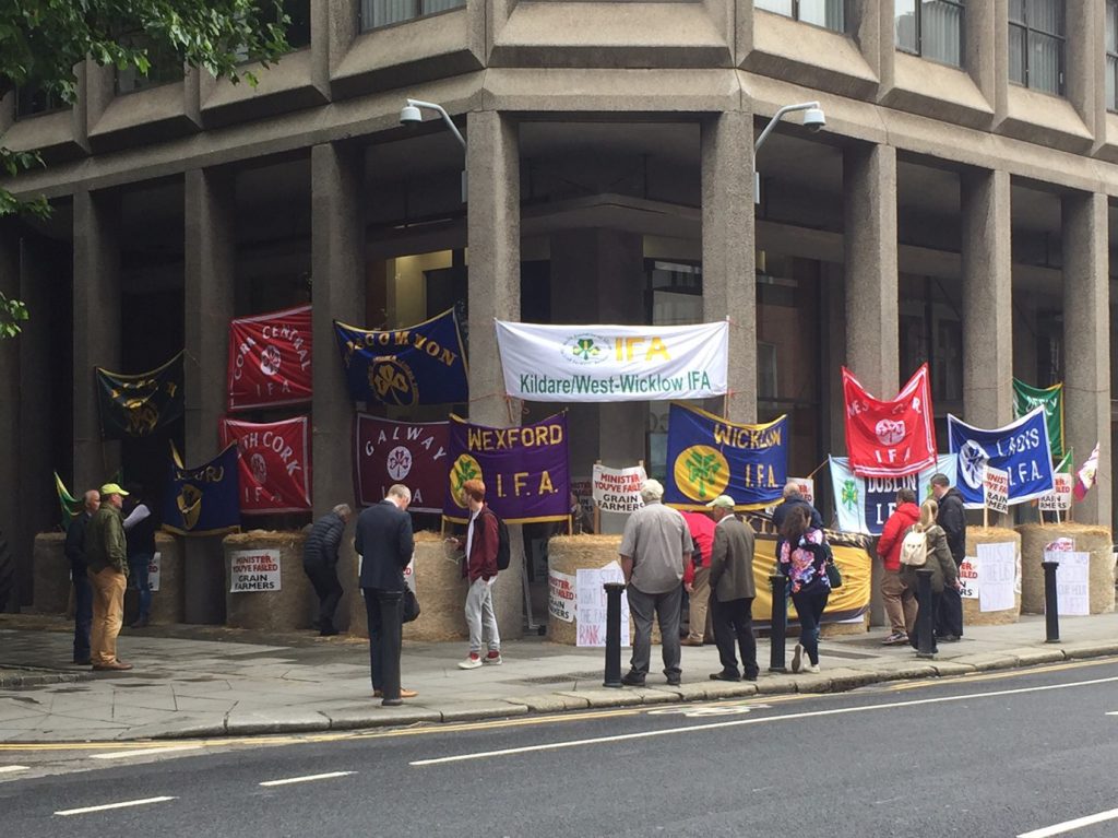 The machine was greeted by a large contingent of IFA protesters; a total of eight 4X4 round bales of straw were also placed outside the building last week.