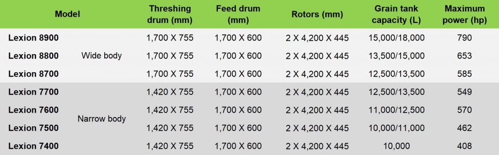 There are seven models within the imminent 7000 and 8000 line-ups (otherwise known as the Lexion ‘Synflow Hybrid’ machines). Their key specifications are outlined in this table (below):
