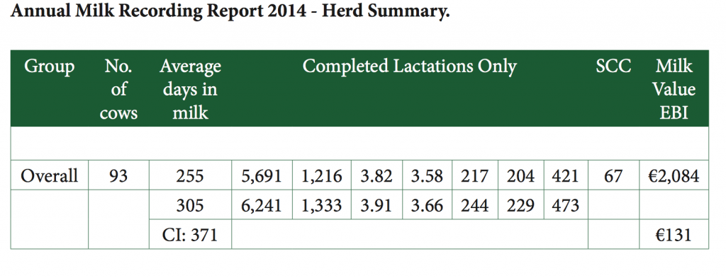 On average, 255 days were spent in milk in 2014. Quota limitations restricted the number of days that cows spent in milk in 2014 and the volume of milk produced as a result. Cows are batch fed in the parlour with an average of 480kg concentrate fed per cow.