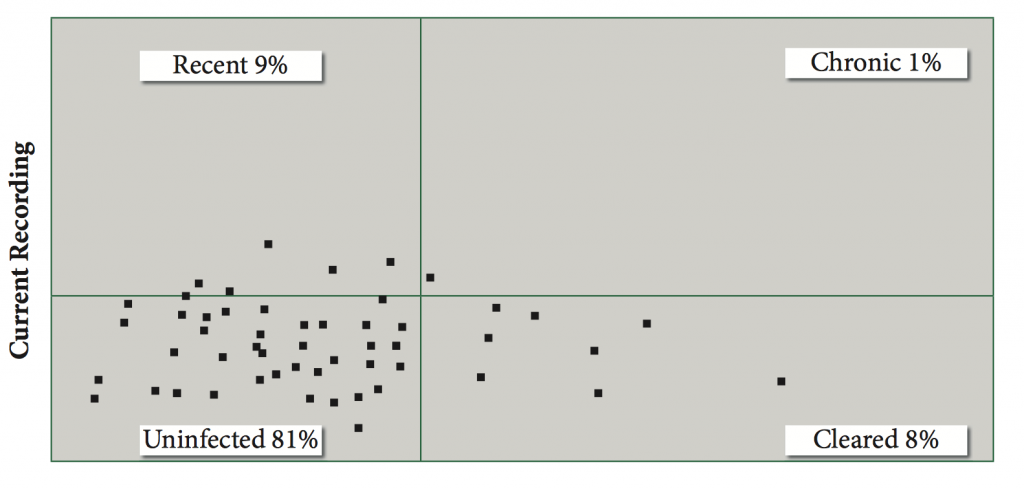 Distribution of cows into chronic, cleared, recent and uninfected categories from milk recording reports (Source: Milk Recording Report, September 2014).