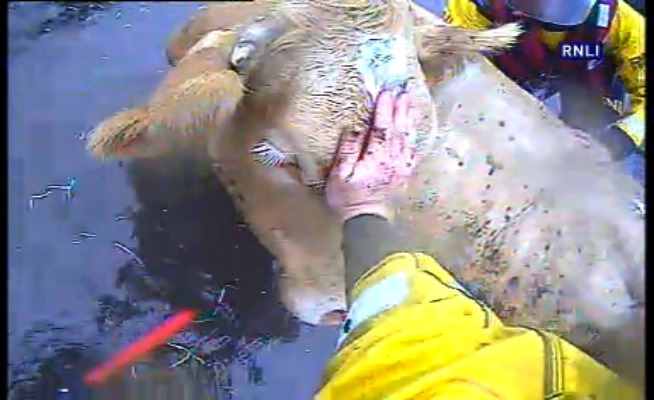 One of the farmers then entered the lifeboat and the crew manoeuvred the lifeboat alongside the cow to enable the farmer to tie a halter/bridle around the cow’s head, according to the RNLI.