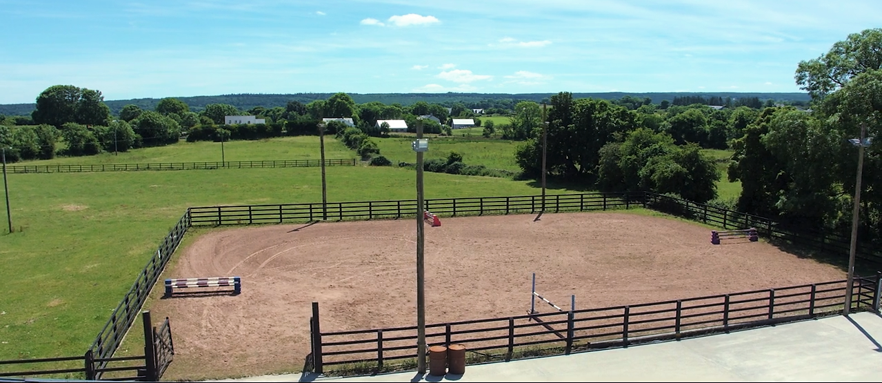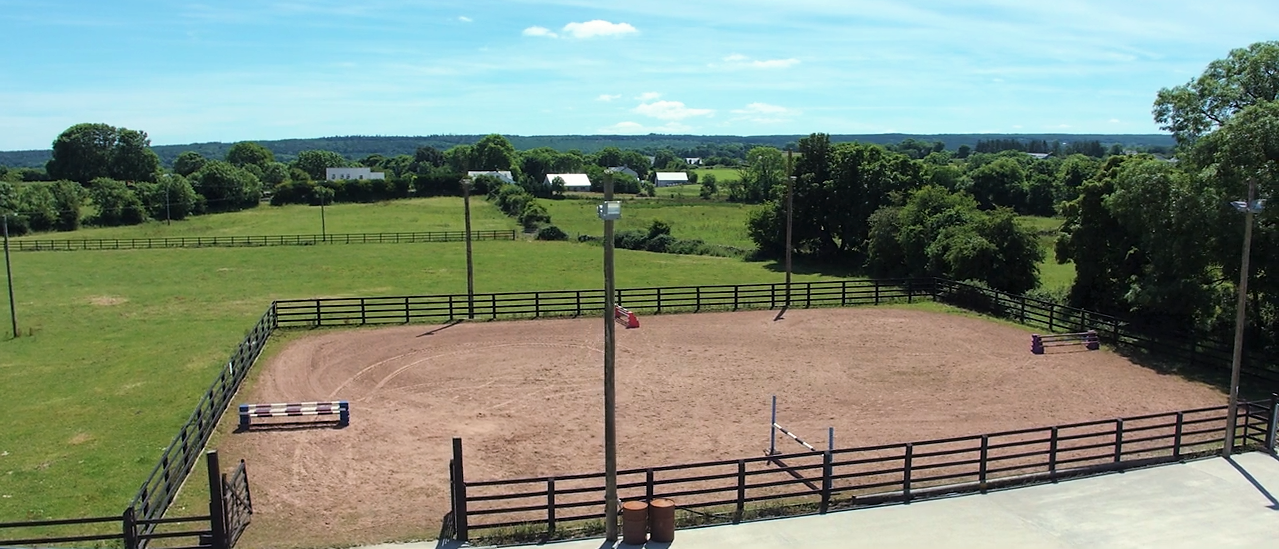 There are a number of outbuildings including: two double garages with an area between them that can be used for storage; seven individual boxes; a tack room with a WC and WHB; and an outdoor, floodlit arena.
