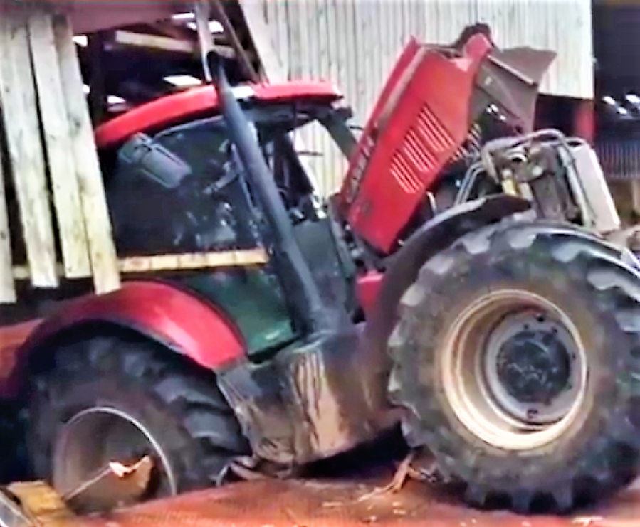 Speeding away from the driver, the tractor apparently destroyed machinery, smashed through the wall of a cattle shed and drove over a silage feeder before being halted by a flat-bed trailer.