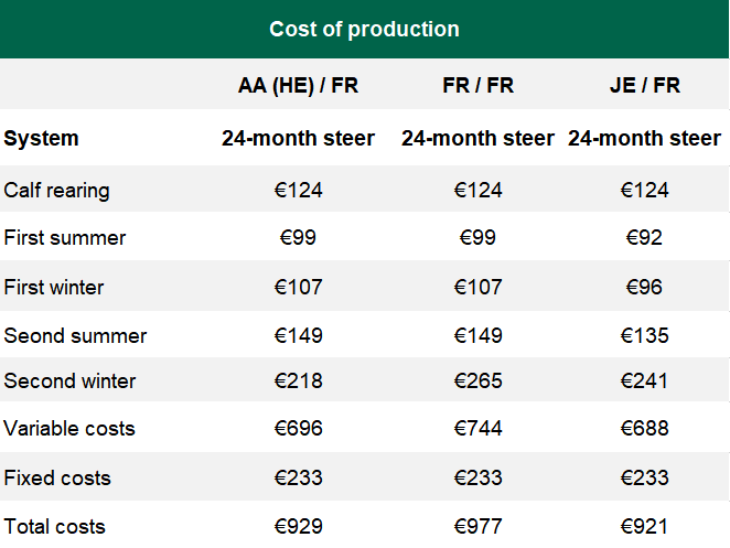 On a typical dairy calf-to-beef operation – farmers slaughtering steers at 24 months-of-age, stocked at 2.5LU/ha, and running at a high level of efficiently – variable and fixed costs amount to approximately €1,000 – this excludes calf purchase price.