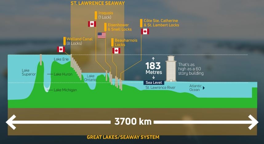 Once finished travelling along the route the ships will have dropped to sea level – a total of 183m, from the lock at Lake Superior to the St. Lawrence River.