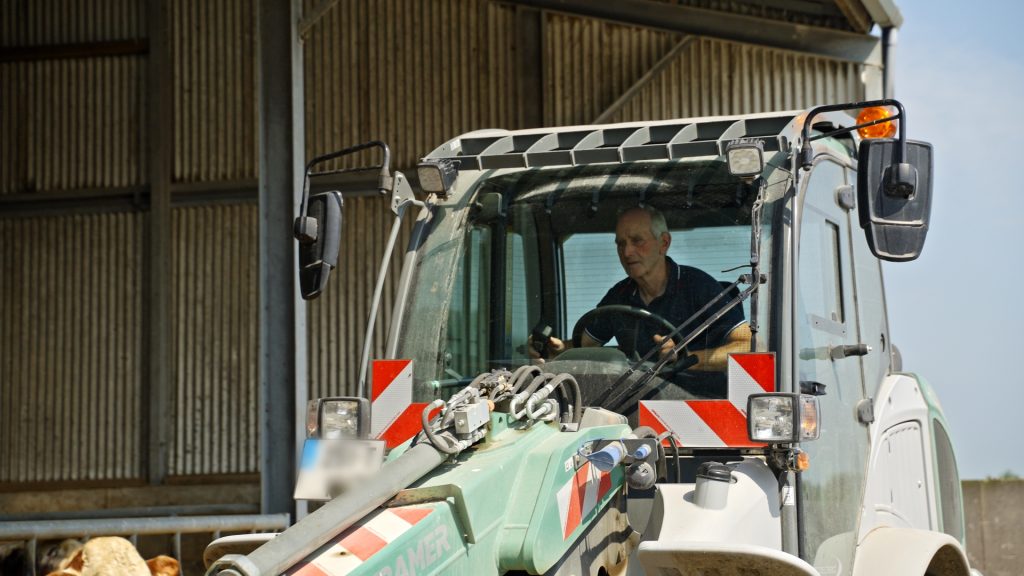 The farmer looks after himself by getting on and off machinery properly and being more conscious around the livestock on the farm.
