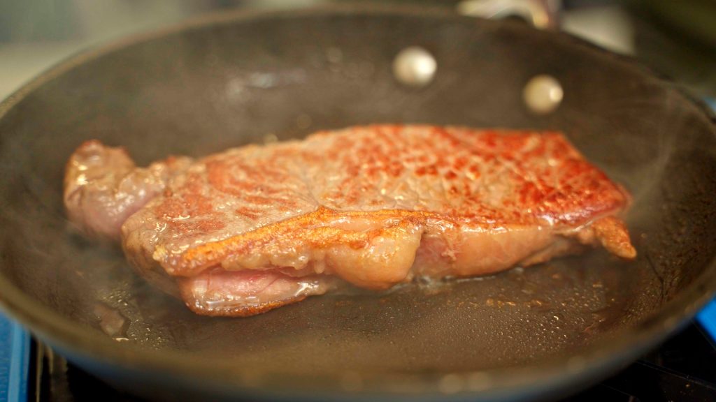 The steak was cooked medium-rare on a searing hot pan before the all important taste test took place.