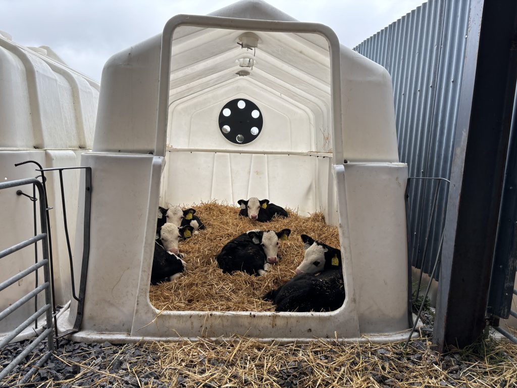 Calves are all reared in group hutches. He aims to have all calves weaned off milk before Christmas, after which they will go into a loose shed.