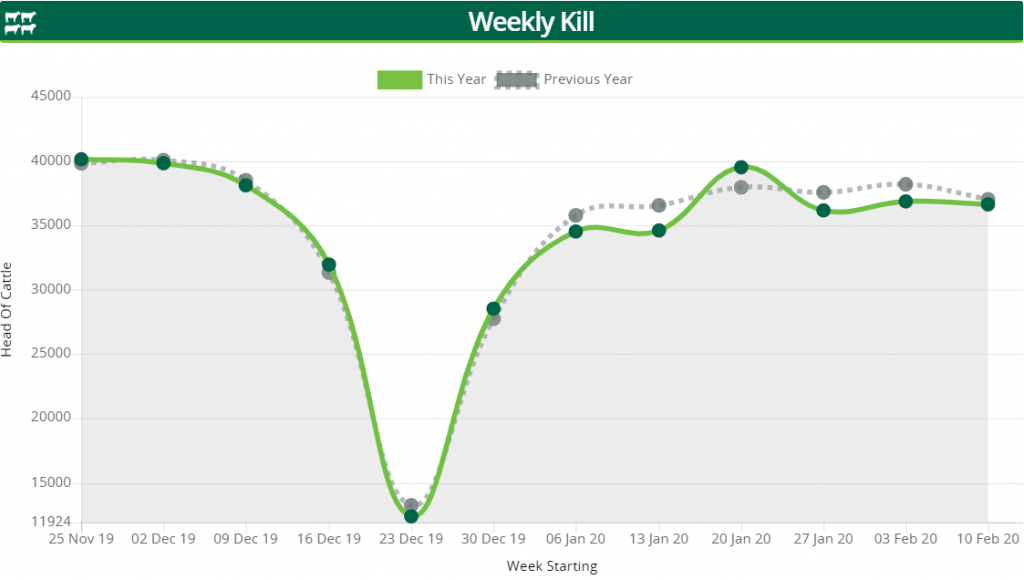 This is a decrease of 266 head on the previous week and some 418 head less than the equivalent week in 2019, when there were 37,041 cattle killed.