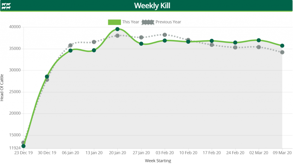 By the corresponding week in 2019, there had been 400,181 head of cattle slaughtered – an increase of 5,310 head in 2020.
