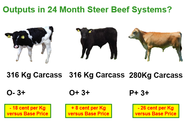 Using research gleaned from the national database over the past five years, along with information from Teagasc Johnstown Castle, Teagasc Grange and the Teagasc Green Acres Programme, a Friesian bull calf – finished under a 24-month steer system – will, on average, achieve a 316kg carcass (O- 3+).