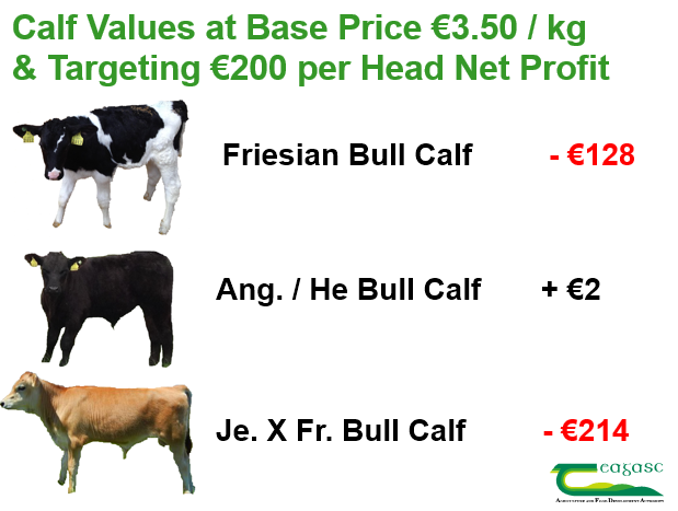 Where a Friesian bull calf had a value of -€8/head in January of this year – based on a base price of €3.90/kg and targeting a €200/head net margin – this has now shifted to a value of -€128/head based on €3.50/kg (targeting the same net margin).