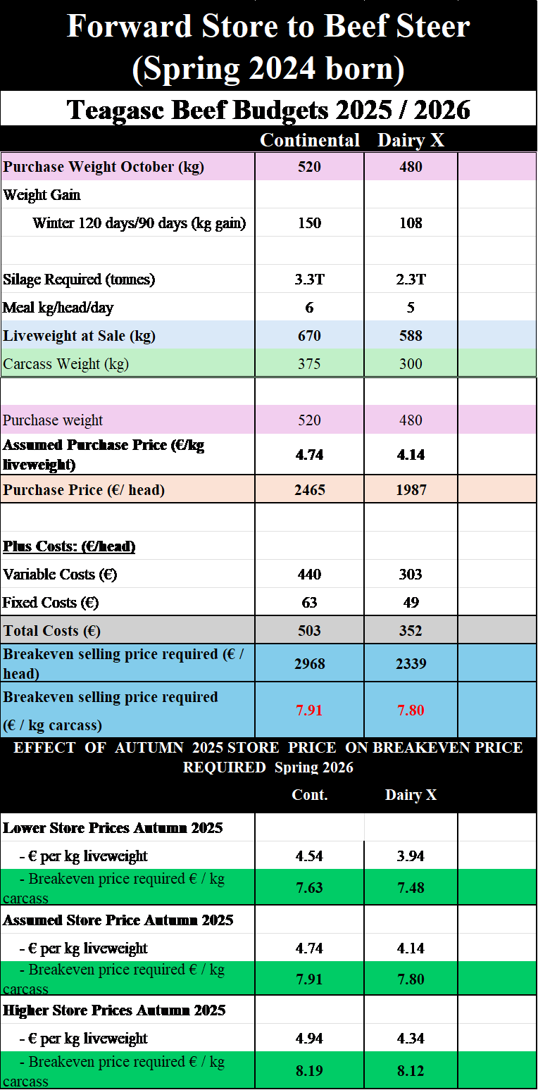 Looking at the forward store to beef data, based on the above costings and assuming a purchase price of €4.74/kg for a 520kg continental steer, the breakeven selling price would be €7.91/kg.