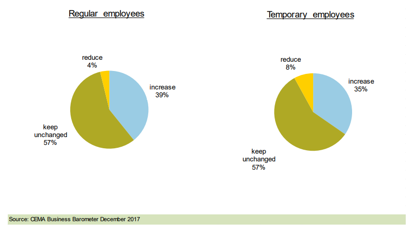 With regard to regular employees, 39% of respondents expected to hire more staff; 57% forecast no change, while just 4% expected to reduce their work-forces.