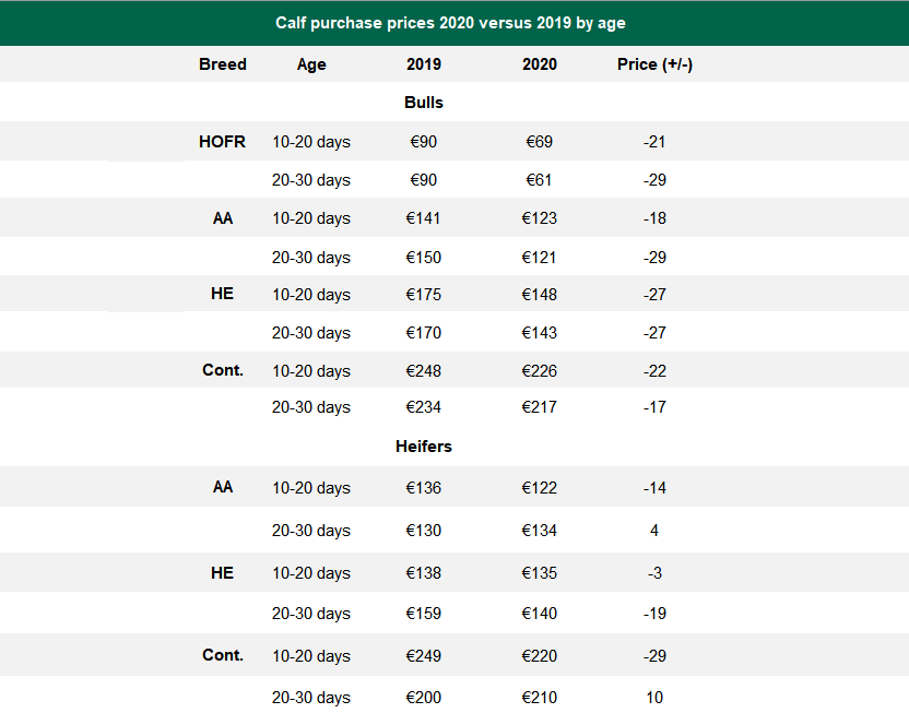 Firstly, in the tables (below), we examine the purchase price of calves sourced by the comparable participating farmers in 2020 versus 2019.