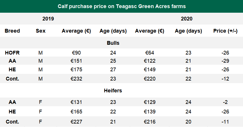 Calf prices have reduced on 2019 levels. An average price of €64/head was paid for Holstein Friesian bulls, €122/head for Aberdeen Angus bulls, €149/head for Hereford bulls and €220/head for continental males this spring.