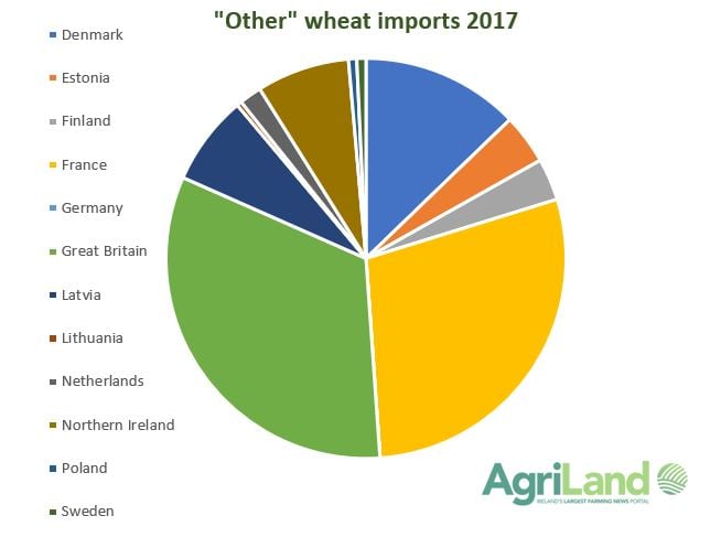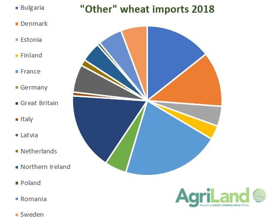 “Other” wheat imports in 2018 came from 14 different countries. France provided the largest proportion of this grain at 21% (90,209t).