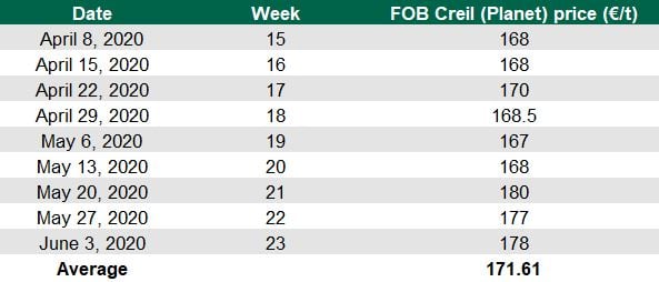 The table below shows the FOB Creil Planet price (€) at the close of business each Wednesday.
