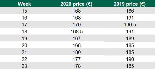 On April 8, the price started out at €168/t. It reached a high of €180/t on May 20 and last week it had climbed back to €178/t having dropped to €177/t the week before.