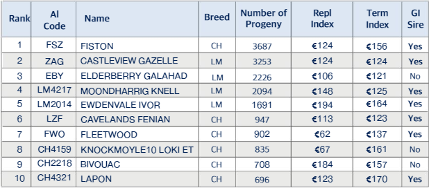 The Irish Cattle Breeding Federation (ICBF) has released the rankings of bulls that sired the most calves born from July 1, 2020 through to December 31, 2020.