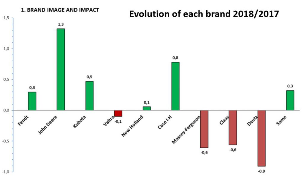 It’s clear that John Deere made the biggest gain, followed by Case IH and Kubota. Deutz-Fahr showed the biggest loss of standing in this part of the 2018 survey, followed by Massey Ferguson and Claas.