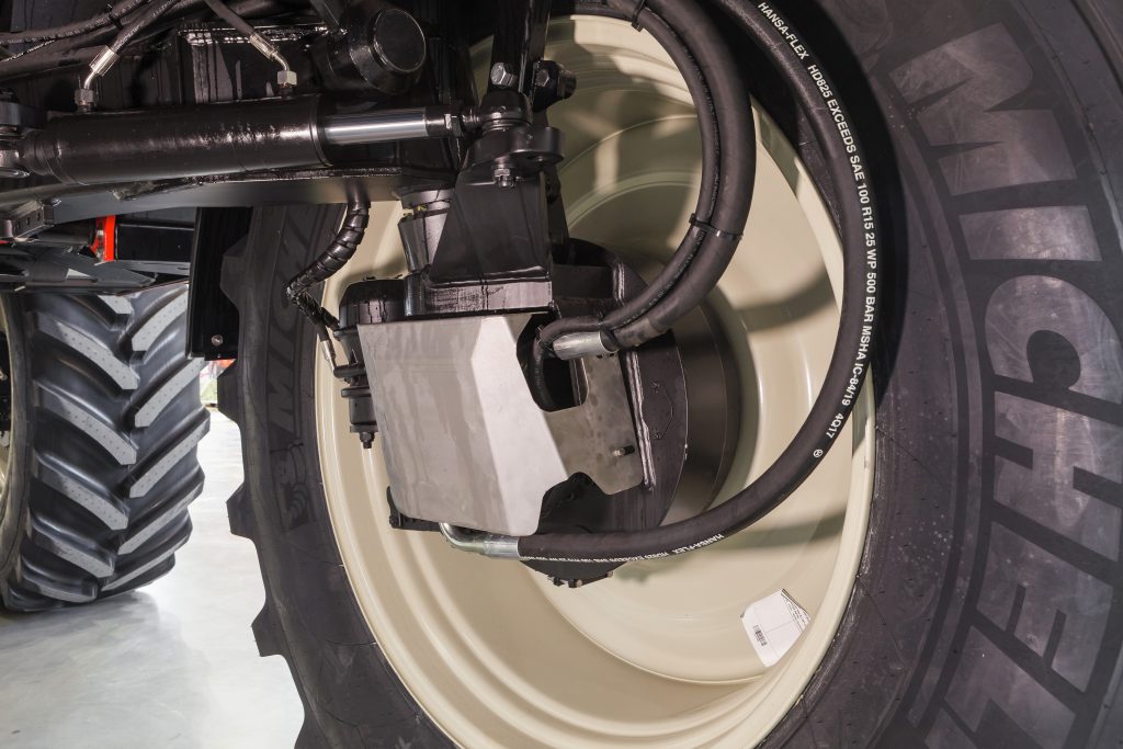 Hydraulic hoses have been mounted on each wheel motor assembly (pictured below) to reduce the width of each ‘wheel cluster’ – to minimise crop damage.
