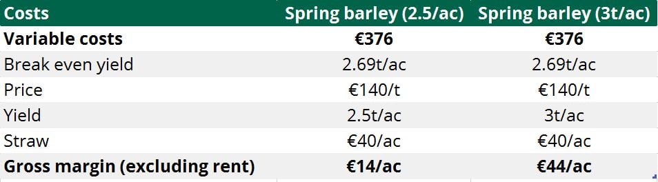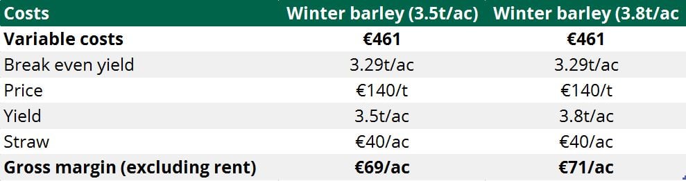 Looking at spring barley, the variable costs associated with growing the crop stand at €376/ac and, at a price of €140/t, a yield of 2.69t/ac is required to break even.