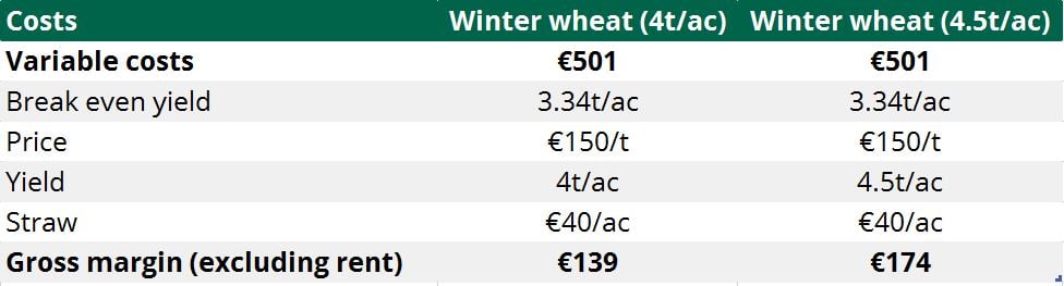 At a green wheat price of €150/t, a 4t/ac winter wheat crop is expected to leave a gross margin of €139/ac. In addition, a 4.5t/ac crop would generate a gross margin of €174/ac when grown on owned land and all of the machinery work was carried out by a contractor.
