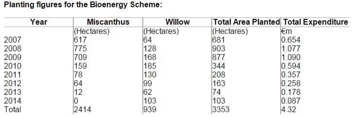 The Department has had a Bio-Energy Establishment Scheme in place since 2007, and this Scheme specifically provides support for the establishment of willow and miscanthus plantations.
