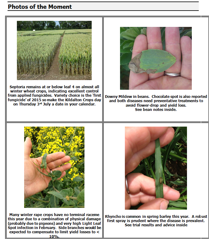 Beans have grown strongly in recent weeks with the first flower buds appearing in many crops now. Wet weather diseases are appearing earlier than usual with reports of Chocolate Spot and Downy mildew from most areas.