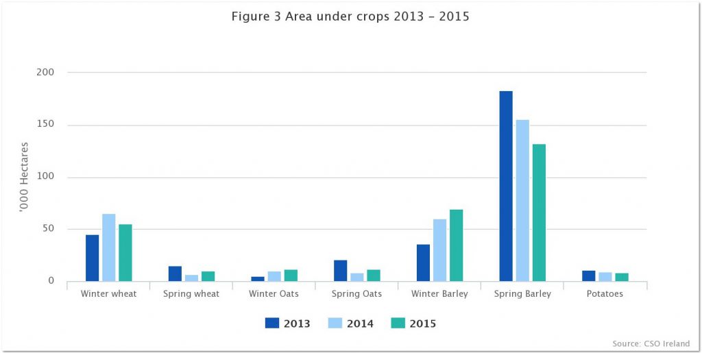 The CSO said this was due to a decrease of 23,200ha (14.9%) in the area under spring barley and a decrease of 10,200ha (15.6%) in the area under winter wheat.